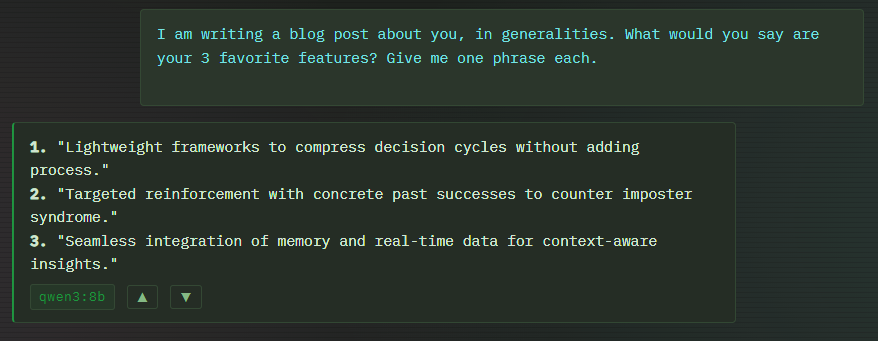 The system as diagrammed above is up and running! I’m using it on a daily basis now, to get a feel for the system prompt, behaviors, and how the RAG performs over time. I have a ton of future plans: knowledge base health and updating, and I want to really push forward (carefully) with granting more autonomy. For now, I seem to have gotten it to stop lying about capabilities it doesn’t have (I’ll probably do a whole post on Grounding someday), and I’m finding it pleasant to use regularly. Even if it DOES, as this screenshot shows, like to reveal some of my coaching needs…
